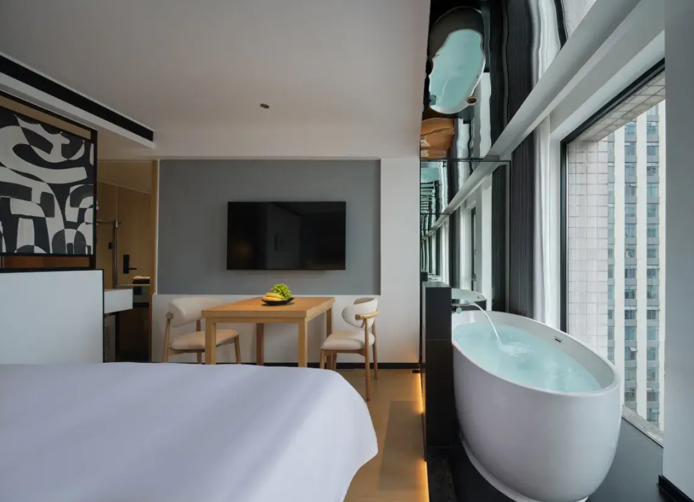 多数客房拥有开阔观景视野,可俯瞰春熙路商圈城市景致,兼顾设计感、舒适感与品质感,让宾客在城市繁华之中,享受静谧舒适的旅居体验。
